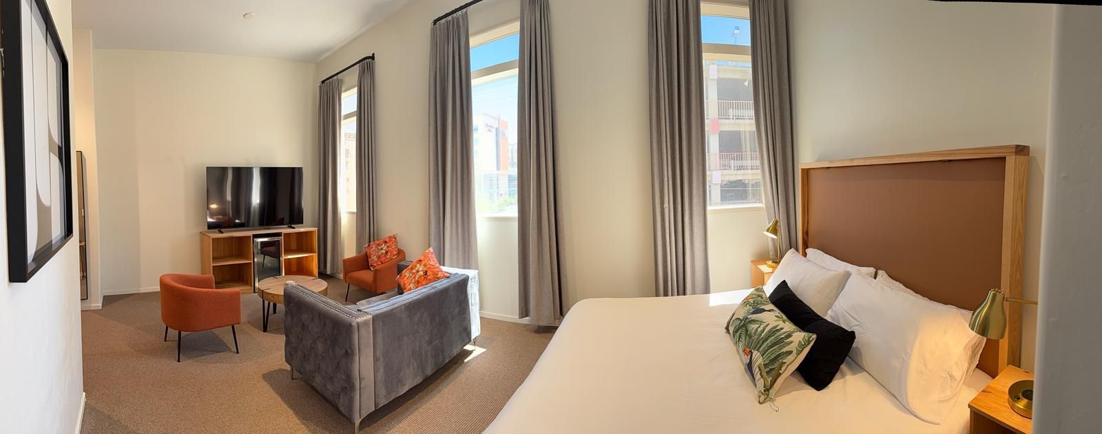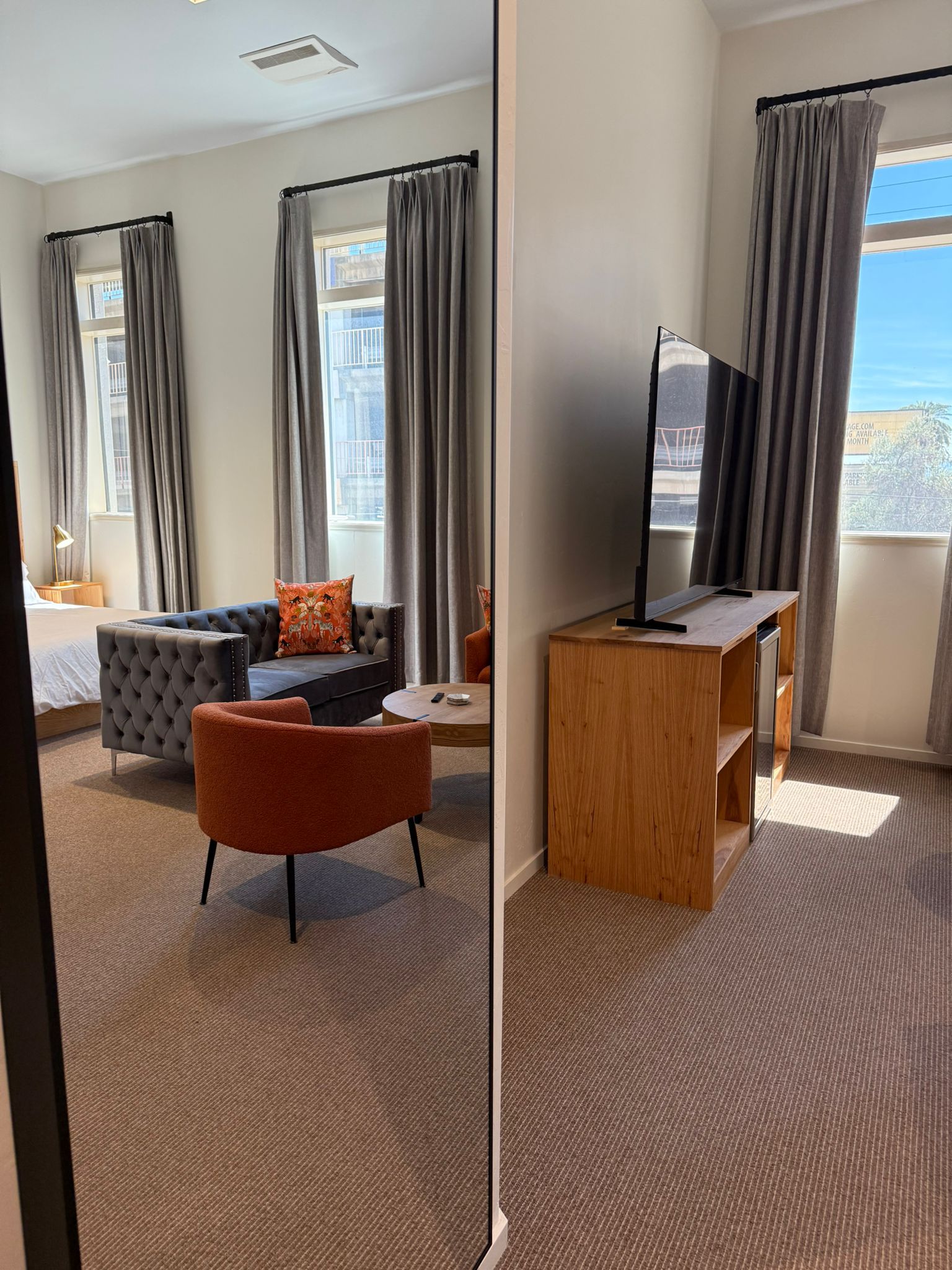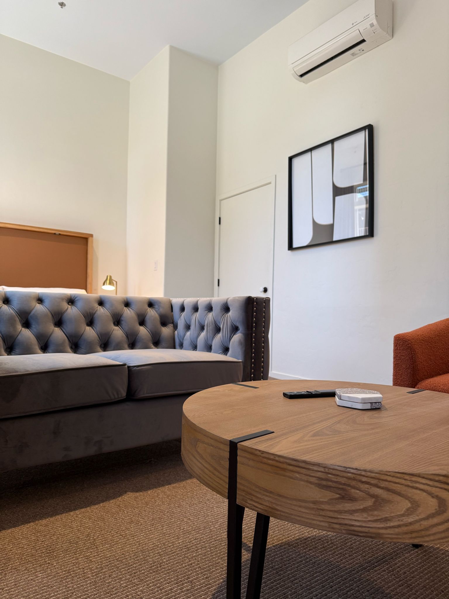 The top floor suites do require you climb one flight of stairs as our historic building's elevator stops one floor down. Indulge in the spacious luxury and unique charm of our king suites, where comfort meets sophistication. Enhance your productivity in our luxurious boutique hotel, where every room is thoughtfully equipped with a desk and complimentary high-speed Wi-Fi. Whether you prefer working in the privacy of your suite or in the vibrant atmosphere of our lobby, bar, or common areas, you'll find the perfect spot to get work done seamlessly.