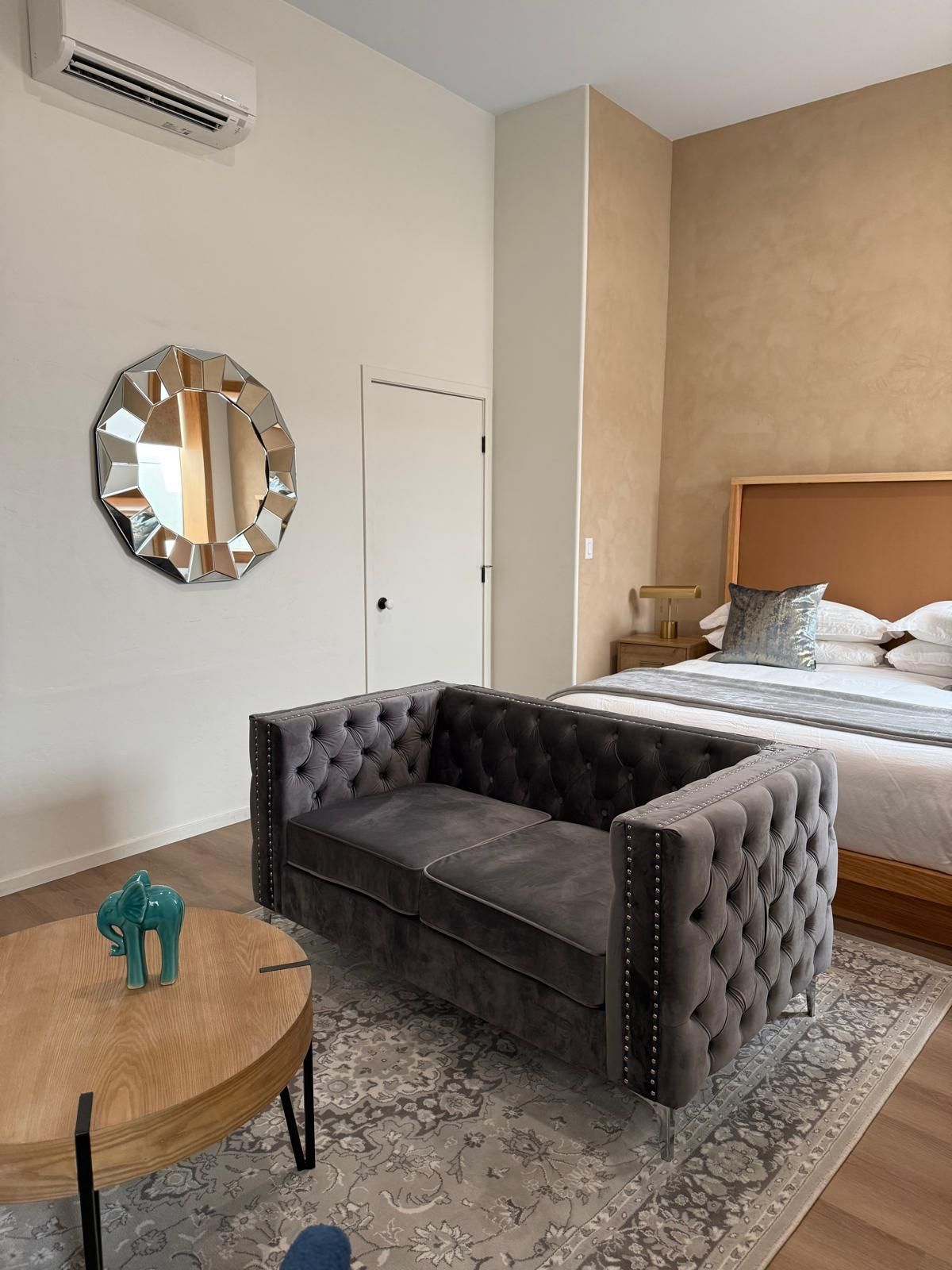 *Stay more than 1 night to receive discounted rates* Experience unparalleled luxury in our lower floor king suites, featuring soaring 14ft ceilings and opulent king-sized beds. Each suite is equipped with a state-of-the-art 75" television and a full bathroom, complete with oversized soaking tubs and separate showers for ultimate relaxation. Every room is a masterpiece, uniquely designed with vibrant splashes of color and subtle contemporary elegance. Perfect for accommodating up to three guests, our suites offer a separate single bed upon request, and a crib for children can also be provided.